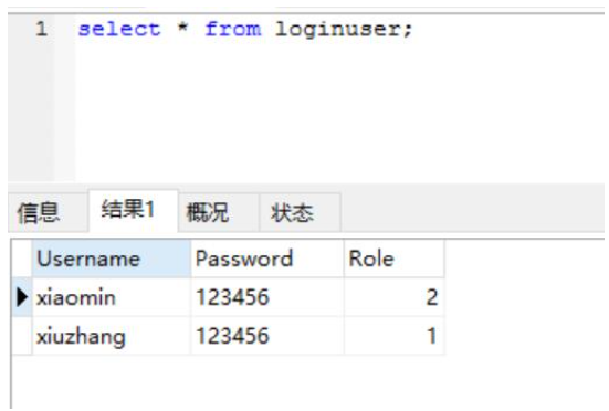 假设现在存在一张表loginuser,包括用户名、密码、权限三个字段。如下图: