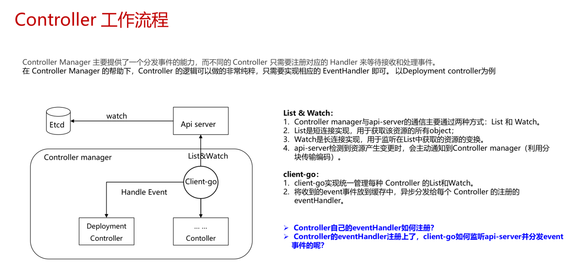 首先消息必须是可靠的,list和watch一起保证了消息的可靠性,避免因消息丢失而造成状态不一致场景。具体而言,list APY可以查询当前的资源及其对应的状态(即期望的状态),客户端通过拿期望的状态和实际的状态进行对比,纠正状态不一致的资源。Watch API和apiserver保持一个长链接,接收资源的状态变更事件并做相应处理。如果仅调用watch API,若某个时间点连接中断,就有可能导致消息丢失,所以需要通过list API解决消息丢失的问题。从另一个角度出发,我们可以认为list API获取全量数据,watch API获取增量数据。虽然仅仅通过轮询list API,也能达到同步资源状态的效果,但是存在开销大,实时性不足的问题。