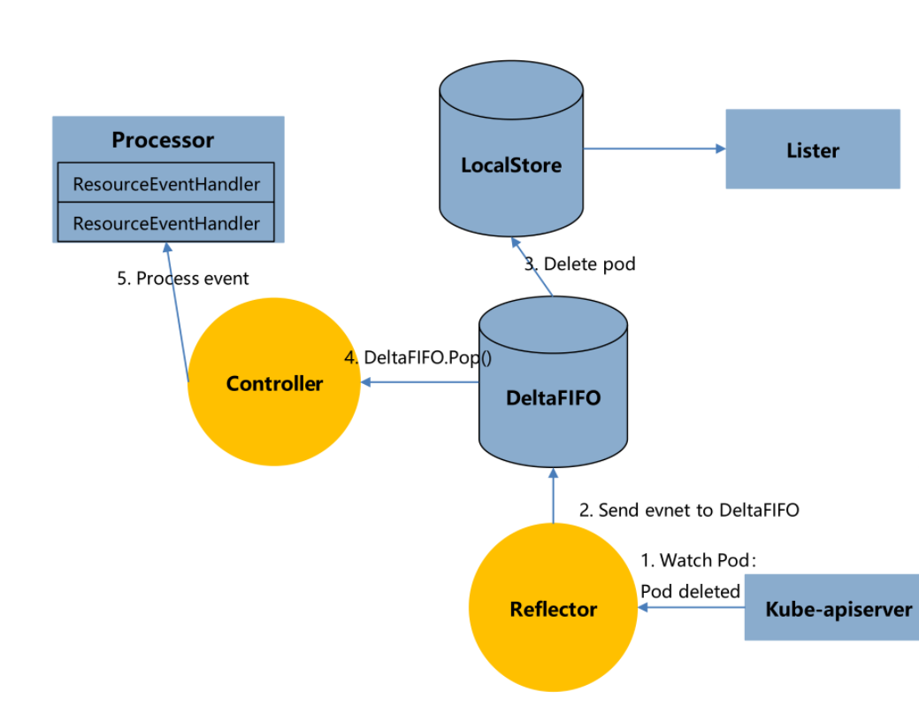 1. Reflector: reflector用来watch特定的k8s API资源。具体的实现是通过ListAndWatch的方法,watch可以是k8s内建的资源或者是自定义的资源。当reflector通过watch API接收到有关新资源实例存在的通知时,它使用相应的列表API获取新创建的对象,并将其放入watchHandler函数内的DeltaFifo队列中。