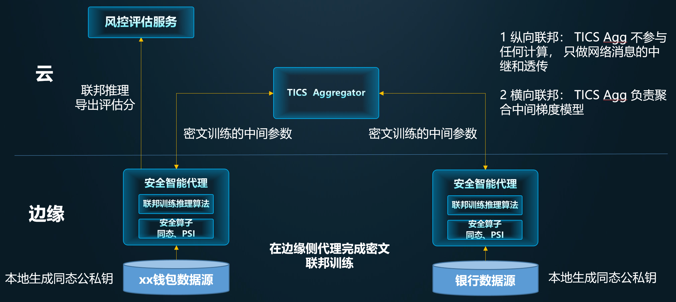互联网金融公司 xx钱包和银行训练数据源,均通过边缘侧的安全智能代理 TICS Agent 接入,前者数据是多维特征值,即机器学习中的 X 值(特征),后者数据是银行记录的个人履约情况,即机器学习中的 Y 值(标签),银行侧也可以提供特征值,是典型的纵向联邦训练场景,每个参与方本地生成同态公私钥对,私钥本地保存,公钥共享给其他参与方。训练任务由 xx钱包侧发起,TICS AGG 负责传递密文状态的中间参数,解决 xx钱包和银行的边缘侧各自部署在内网,网络无法直连的问题。训练后的模型每个参与方各自存储部分模型,经过两方的离线批量或在线联邦推理后,生成的信用评估分发布到云测的信用分服务中,该分值封装为外部可直接调用的风控评估服务接口,满足银行侧新增用户的风控检测需求。