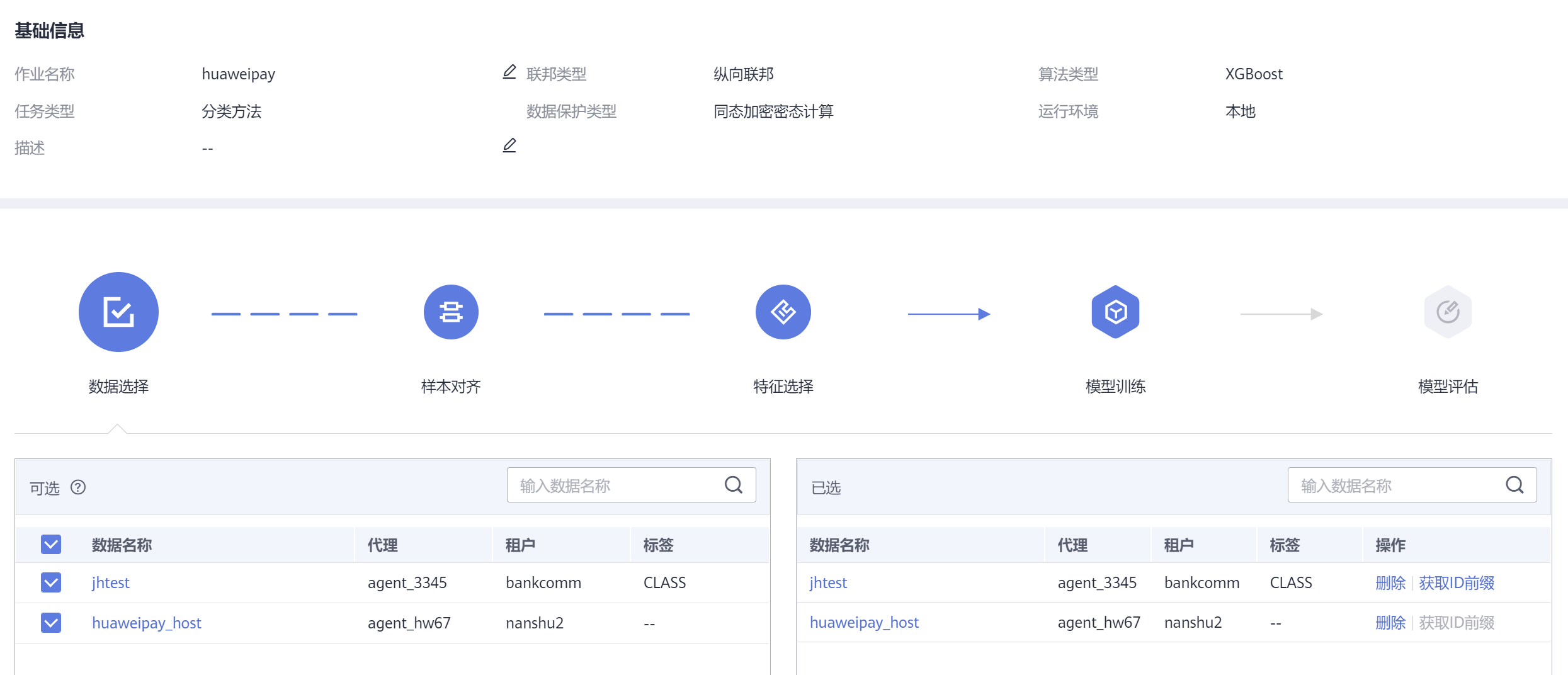 - 数据选择:勾选 xx钱包和银行侧上传的训练数据集,点击右下角红色按钮 “下一步”