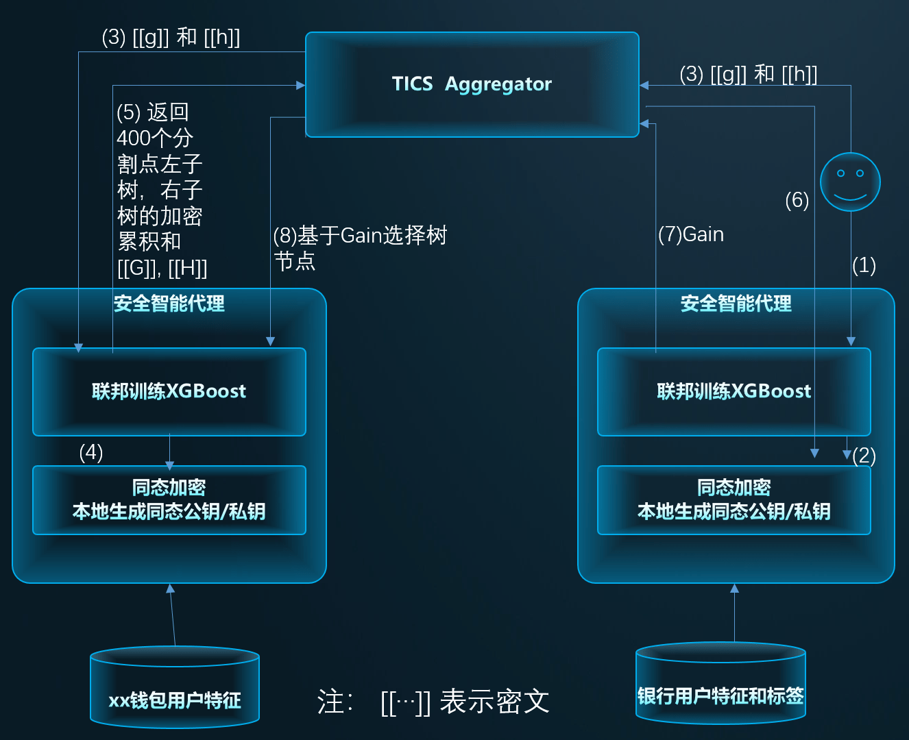 - 交行启动训练,触发 XGBoost 算法,本地 XGBoost 算法基于用户标签,生成每个样本的一阶梯度 g 和二阶梯度 h