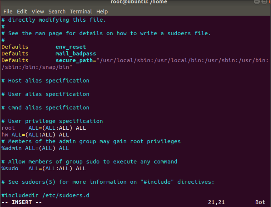 hw ALL=(ALL:ALL) ALL #在文件中添加此句,保存退出