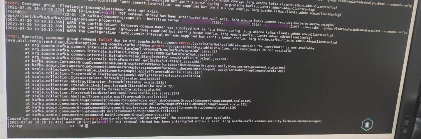 3、describe查看代码指定的消费组,发现报“coordinator is not available”异常,如下图所示。