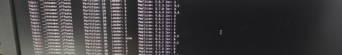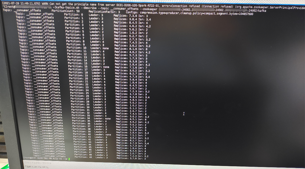 5、由3、4现象判断,现场使用的groupid所在__consumer_offsets分区丢失了leader(group coordinator节点就是消费组经过计算后的partitaion分区leader),查看__consumer_offsets情况如下:
