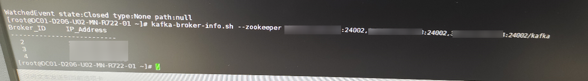 sh zkCli.sh -server x.x.x.x:24002/kafka --x.x.x.x为zk节点业务ip