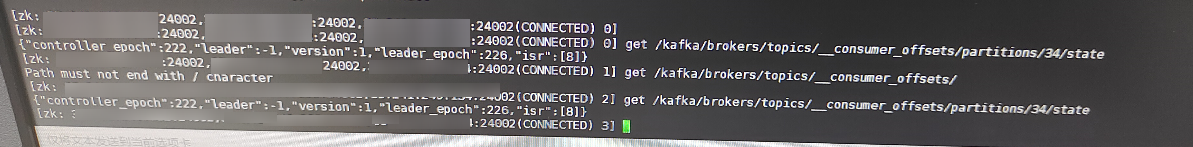 10、根据第9步公式计算出现场使用的groupid所在的__consumer_offsets分区时34号,但是因为34号分区leader为none,zookeeper上查看34分区state为-1。所以该消费组的coordinator不存在。无法消费到数据。其他分区leader为none现象一样。