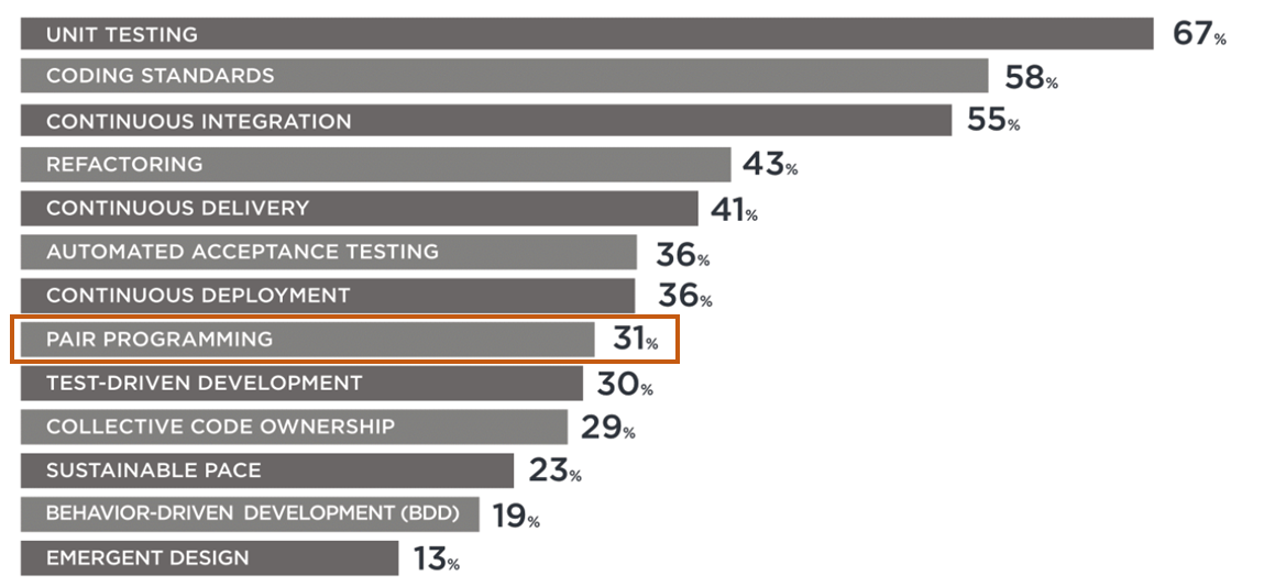 关于结对编程在网上有很多声音,相对比其他的敏捷实践,它的争议几乎是最大的。根据VersionOne的14届年度敏捷状态报告,在组织采用的敏捷工程实践中,结对编程占受访企业的31%,排第八位,仅次于持续部署,高于TDD,由此可见,结对编程还是有一席之地、可取之处的。