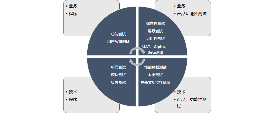 根据测试四象限,从业务和技术的角度、以及程序和产品的角度将测试内容进行类划分,如下图所示。