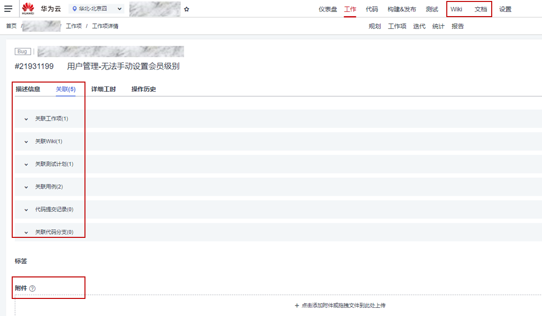 尽管敏捷开发中采用轻文档的形式,但同样也要做好相关文档的管理。在测试初始要约定相关测试交付物的管理和存放形式,包括不限于测试策略、测试工件、缺陷、测试数据、虚拟服务和自动化脚本等。通常会在项目管理工具中进行管理,和开发的工作项之间建立关联,这样便于后续进行追溯和查看。以华为云DevCloud为例,可以将文档上传到【Wiki】和【文档】中,然后在工作项中建立关联。