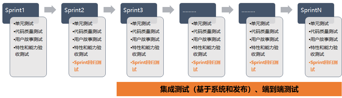 在敏捷开发模式下,测试不只是一个阶段,而是一个活动,每个Sprint都有测试活动。每个迭代都会进行单元测试、代码质量测试、用户故事测试、特性和能力验收测试;从Sprint2开始都要进行一次Sprint级别的回归测试,以自动化测试的形式实现。累积了几个迭代之后,在发布前要进行端到端的集成测试。如下图所示。