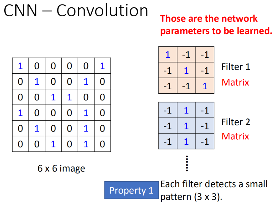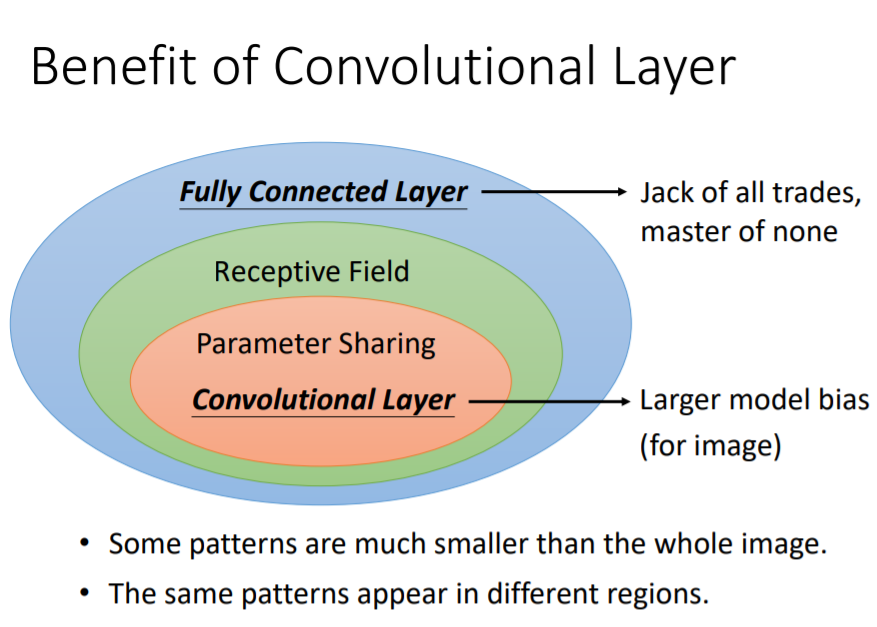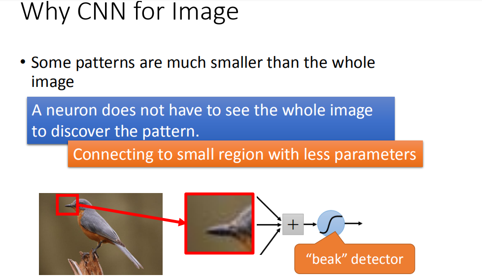 假设我们现在有一张图片,第一个 hidden layer的某一种neural的工作就是要侦测有没有鸟嘴的存在(有一些neural侦测有没有爪子的存在,有没有一些neural侦测有没有翅膀的存在,有没有尾巴的存在,合起来就可以侦测图片中某一只鸟)。假设有一个neural的工作是要侦测有没有鸟嘴的存在,那并不需要看整张图,其实我们只需要给neural看着一小红色方框的区域(鸟嘴),它其实就可以知道说,它是不是一个鸟嘴。对人来说也是一样,看这一小块区域这是鸟嘴,不需要去看 整张图 才知道这件事情。所以,每一个neural连接到每一个小块的区域就好了,不需要连接到整张完整的图。