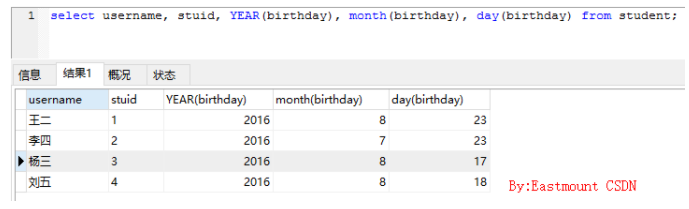 (3)获取日期的年月日,使用YEAR()、month()、day()函数