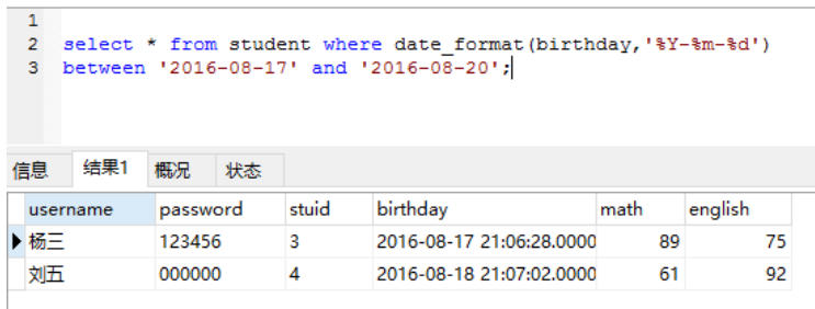 判断日:date_format(birthday,'%Y-%m-%d')='2016-08-23'