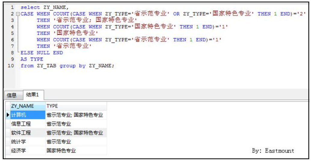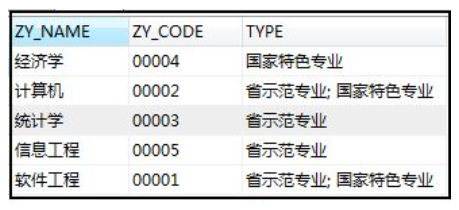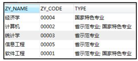 输出如下图所示结果,其错误是当count(ZY_NAME)=1时,“国家特色专业”也变成了“省示范专业”,所以仅仅通过判断出现的次数方法不太好。