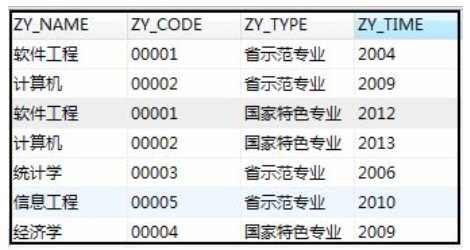 假设现在存在一张专业表ZY,仅仅保存专业名称和专业代码,需要通过连接两张表ZY(专业表)和ZY_TAB(优势专业表)来统计各专业的优势专业信息,怎么处理呢?