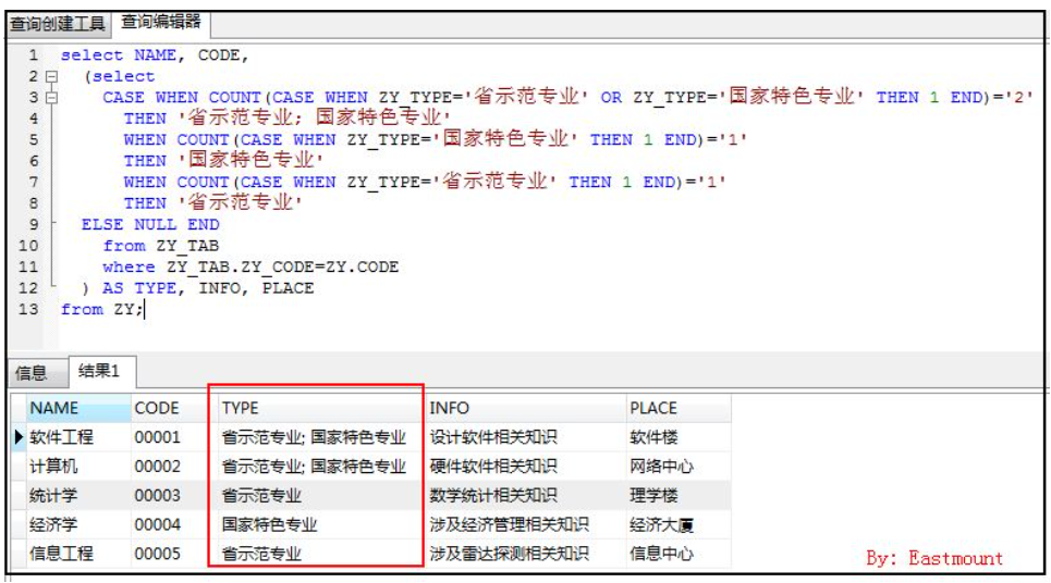 此时需要使用CASE WHEN来判断,这里使用了两次CASE WHEN,第一次是判断是“国家特色专业”或“省示范专业”,第二次是判断该专业出现的次数,如果出现两次则表示两个类型都存在。