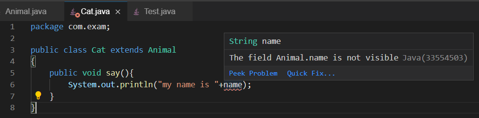 而一个继承类,虽然继承了Animal类,但是想直接访问它的private修饰的属性,那是不行的,编译时就会报错。
