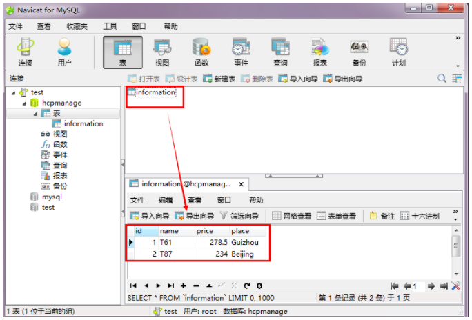 1.首先,创建数据库hcpmanage,表information,主要记录车票信息。