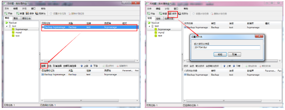 3.然后弹出的对话框中,双击可用任务"Backup hcpmanage",并选择任务。点击保存按钮,设置为"20170418bf"。