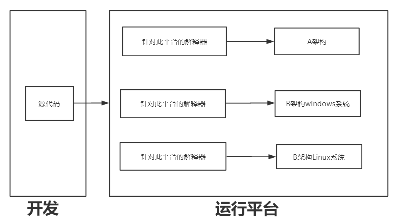 但是,解释型语言在不同的平台有不同的解释器,源代码跨平台的目的实现了,开发人员不用再考虑每个平台如何去编译,只需要关注代码的编写,编写完的代码在任何平台都能无需修改(或少量修改)就能正确执行。例如,Linux系统中执行Python源代码时支持 fork()函数,而window系统中不支持这个函数,如果将运行在Linux系统中的源代码移植到Windows系统,这时就需要进行修改。
