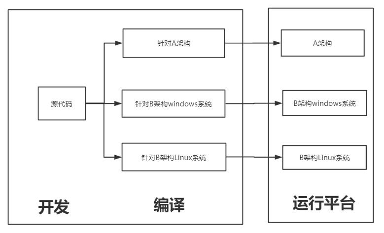 注意:这里涉及到跨平台的概念,平台可以理解为不同CPU架构(例如X86、ARM等)的机器和同种CPU但不同的操作系统(例如Unix、Windows等)的机器。