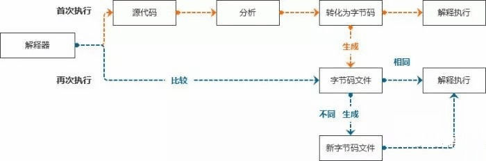 源代码无需预先编译成可执行程序。在程序执行时,解释器读取一句源代码之后,先进行词法分析和语法分析,再将源代码转换为解释器能够执行的中间代码(字节码),最后,由解释器将中间代码解释为可执行的机器指令。所以,编译型语言的可执行程序产生的是直接执行机器指令,而解释型语言的每一句源代码都要经过解释器解释为可以执行的机器指令,相比之下解释型语言的执行效率会低一些。