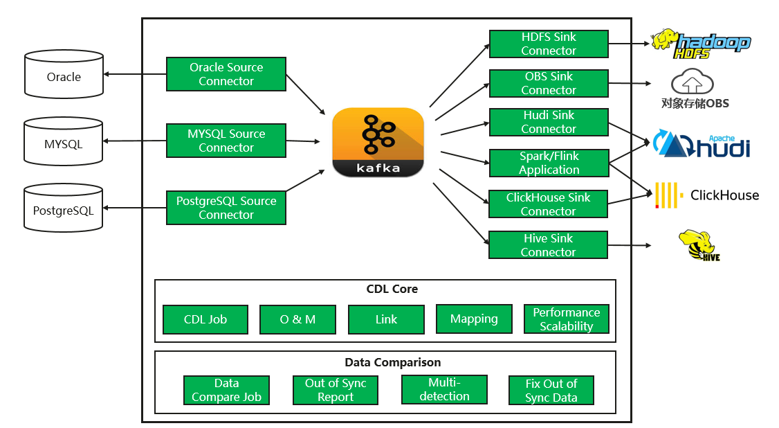 MRS CDL(Change Data Loader)是一款基于Kafka Connect的CDC数据同步服务,可以从多种OLTP数据源捕获数据,如Oracle、MySQL、PostgreSQL等,然后传输给目标存储,该目标存储可以大数据存储如HDFS,OBS,也可以是实时数据湖Hudi等。
