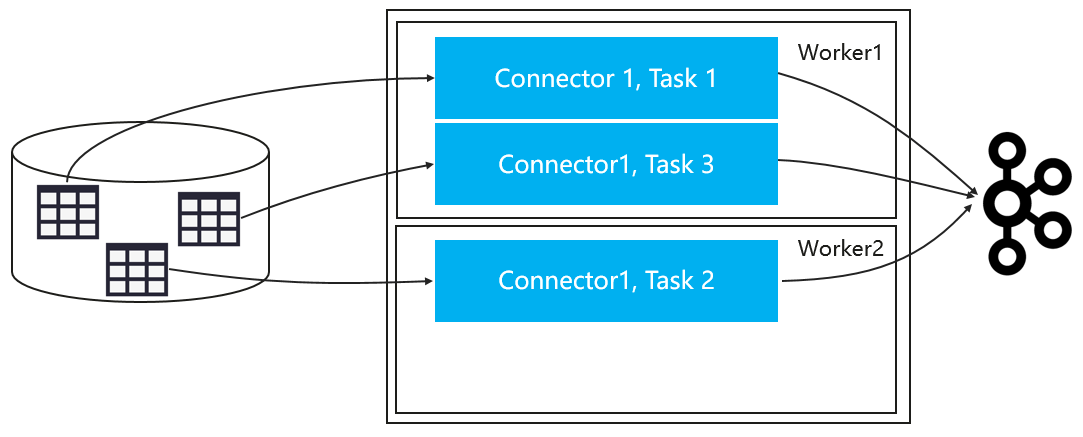 我们利用Kafka Connect提供的任务并行化功能,其中Connect可以将作业拆分为多个任务来并行复制数据,如下所示: