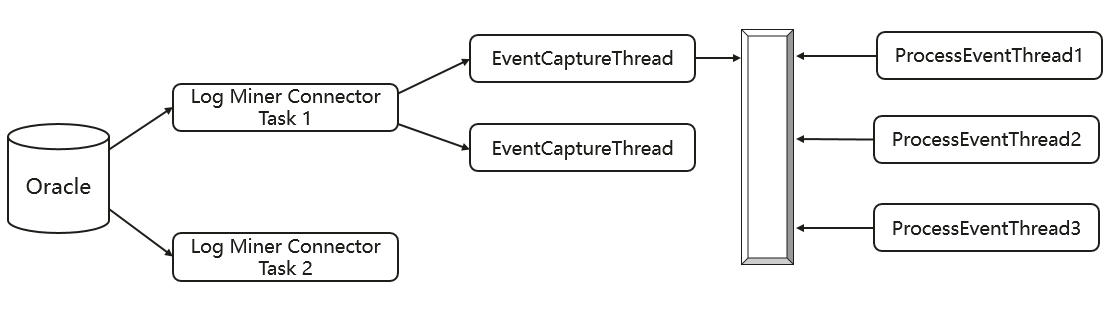 由于Log Miner,Bin Log等数据复制技术的限制,我们的Source Connector只能顺序的捕获CDC事件,因此,为了提高性能,我们将这些CDC事件先缓存到内存队列中,然后使用Executor线程并行的处理它们。这些线程会先从内部队列中读取数据,然后处理并且推送到Kafka中。