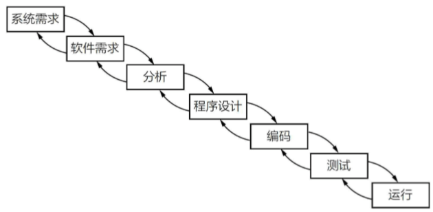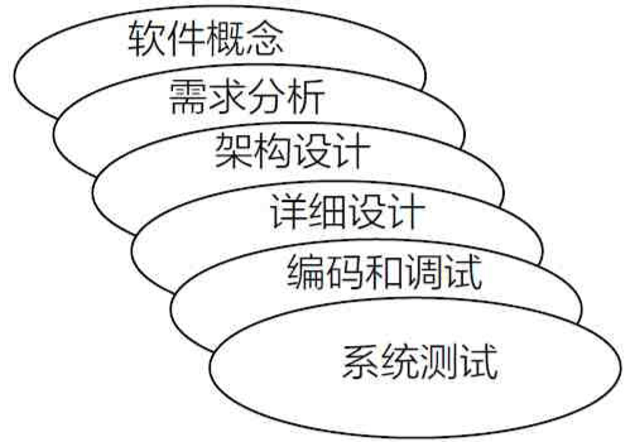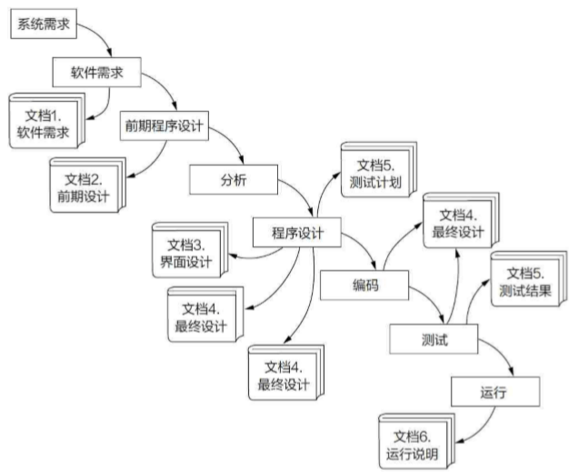 当软件行业还在年幼的时期,它从别的成熟行业 (硬件设计,建筑工程)借用了不少经验和模 型。在那些“硬”的行业中,产品大多遵循 [分析→ 设计→实现(制造)→销售→维护] 这个流程。 由于在“硬”行业中产品一旦大规模生产,要再返 回去修改时就非常困难,甚至是不可能的。因此 这个模型描述了单向的、不可逆的生产过程
