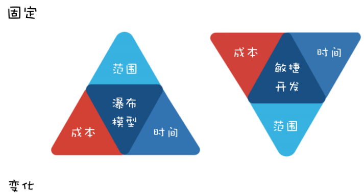 借鉴一下著名的"金三角"理论:瀑布模型种范围是固定的,时间和成本是可变;敏捷开发中成本和时间是固定的,范围是可变的。