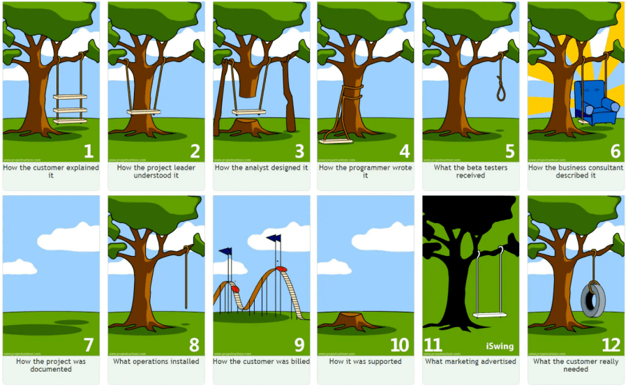 3. 工程师按照产品经理的要求设计产品。两个树枝上挂上秋千哪还能荡漾起来吗?除非是把树从中截断再支起来,这样就满足要求了。