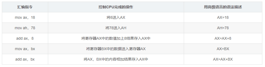 例如:机器指令1000100111011000表示把寄存器BX的内容送到AX中。汇编指令则写成 mov ax,bx 。这样的写法与人类语言接近,便于阅读和记忆。