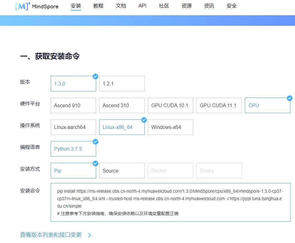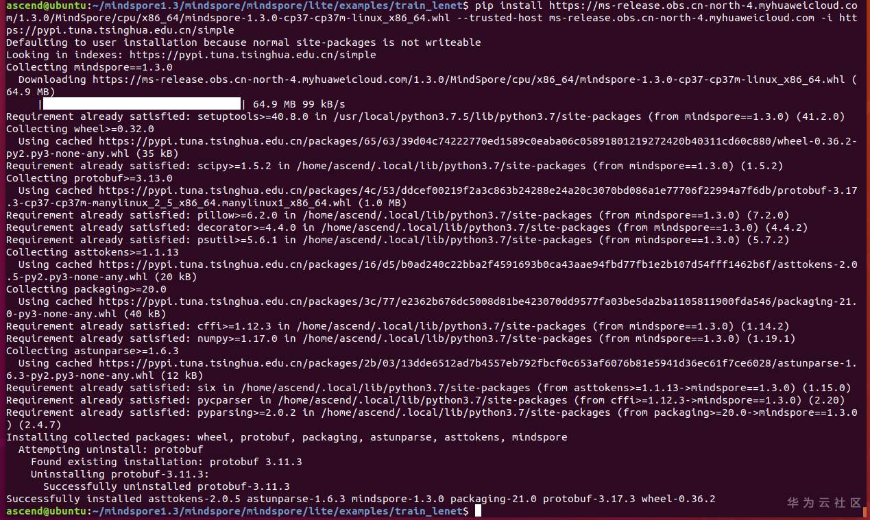 pip install https://ms-release.obs.cn-north-4.myhuaweicloud.com/1.3.0/MindSpore/cpu/x86_64/mindspore-1.3.0-cp37-cp37m-linux_x86_64.whl --trusted-host ms-release.obs.cn-north-4.myhuaweicloud.com -i https://pypi.tuna.tsinghua.edu.cn/simple