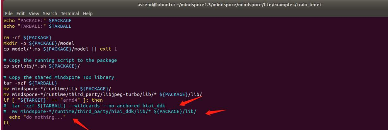 由于目前端侧训练不支持NPU,虽然上面报了找不到hiai_ddk的错,也不用去官网下载ddk,而是需要编辑 prepare_and_run.sh文件,注释掉处理hiai_ddk的部分: