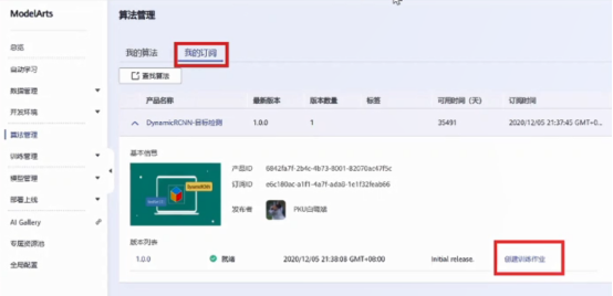 搜索“DynamicRCNN”,进入选择订阅,之后在自己的ModelArts控制台算法管理“我的订阅”中便可以看到该算法。