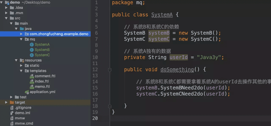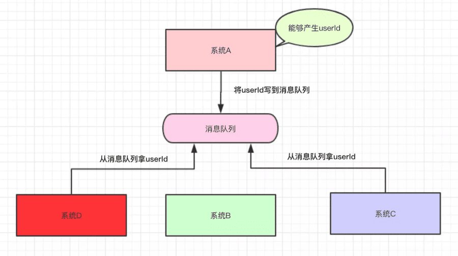 然后,公司招来一个大佬,大佬经过几天熟悉,上来就说: 将系统A的userId写到消息队列中,这样系统A就不用经常改动了 。为什么呢?下面我们来一起看看: