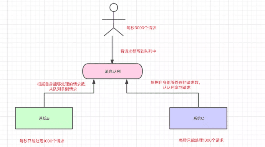 系统B和系统C 根据自己的能够处理的请求数去消息队列中拿数据 ,这样即便有每秒有8000个请求,那只是把请求放在消息队列中,去拿消息队列的消息 由系统自己去控制 ,这样就不会把整个系统给搞崩。