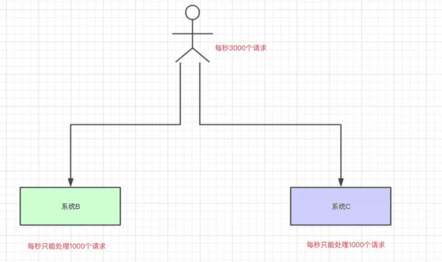 我们再来一个场景,现在我们每个月要搞一次大促,大促期间的并发可能会很高的,比如每秒3000个请求。假设我们现在有两台机器处理请求,并且每台机器只能每次处理1000个请求。