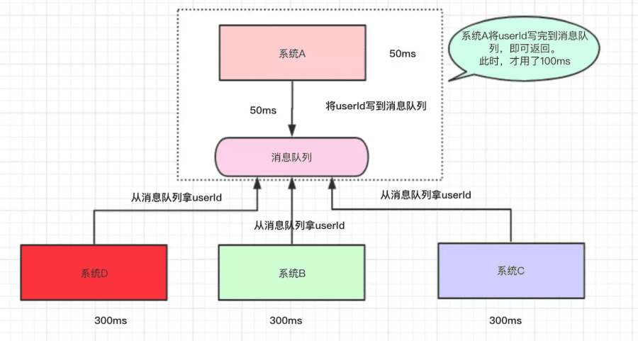 系统A执行完了以后,将userId写到消息队列中,然后就直接返回了(至于其他的操作,则异步处理)。
