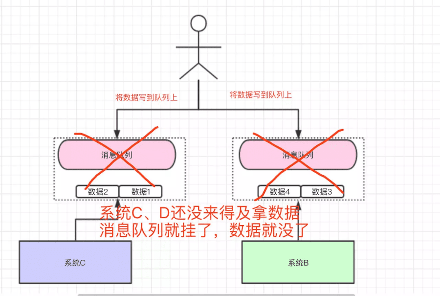 我们将数据写到消息队列上,系统B和C还没来得及取消息队列的数据,就挂掉了。 如果没有做任何的措施,我们的数据就丢了 。