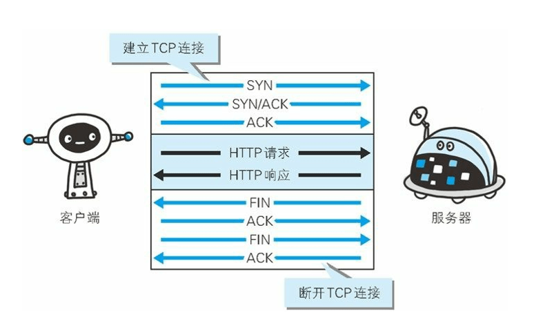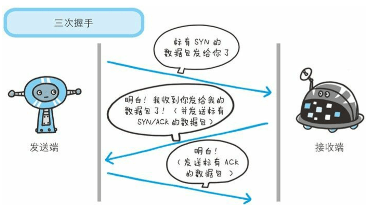 握手过程中使用了 TCP 的标志(flag) —— SYN(synchronize) 和 ACK(acknowledgement)。 发送端首先发送一个带 SYN 标志的数据包给对方。接收端收到后, 回传一个带有 SYN/ACK 标志的数据包以示传达确认信息。最后,发 送端再回传一个带 ACK 标志的数据包,代表“握手”结束。 若在握手过程中某个阶段莫名中断,TCP 协议会再次以相同的顺序发 送相同的数据包。