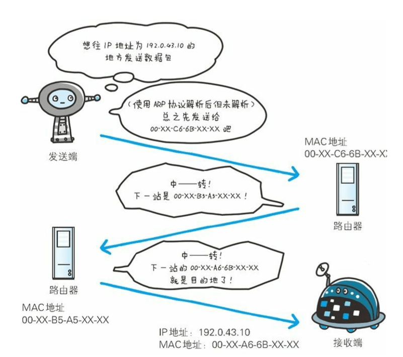 使用 ARP 协议凭借 MAC 地址进行通信 IP 间的通信依赖 MAC 地址。在网络上,通信的双方在同一局域网 (LAN)内的情况是很少的,通常是经过多台计算机和网络设备中转 才能连接到对方。而在进行中转时,会利用下一站中转设备的 MAC 地址来搜索下一个中转目标。这时,会采用 ARP 协议(Address Resolution Protocol)。ARP 是一种用以解析地址的协议,根据通信方 的 IP 地址就可以反查出对应的 MAC 地址。