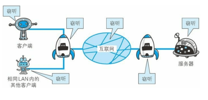 如果要问为什么通信时不加密是一个缺点,这是因为,按 TCP/IP 协议族的工作机制,通信内容在所有的通信线路上都有可能遭到窥视。所谓互联网,是由能连通到全世界的网络组成的。无论世界哪个角落的服务器在和客户端通信时,在此通信线路上的某些网络设备、光缆、计算机等都不可能是个人的私有物,所以不排除某个环节中会遭到恶意窥视行为。即使已经过加密处理的通信,也会被窥视到通信内容,这点和未加密的通信是相同的。只是说如果通信经过加密,就有可能让人无法破解报文信息的含义,但加密处理后的报文信息本身还是会被看到的。