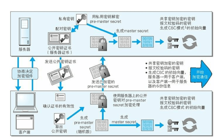 下面是对整个流程的图解。图中说明了从仅使用服务器端的公开密钥 证书(服务器证书)建立 HTTPS 通信的整个过程。