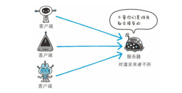 (4)无法判定请求是来自何方、出自谁手。即使是无意义的请求也会照单全收。无法阻止海量请求 下的 DoS 攻击(Denial of Service,拒绝服务攻击)