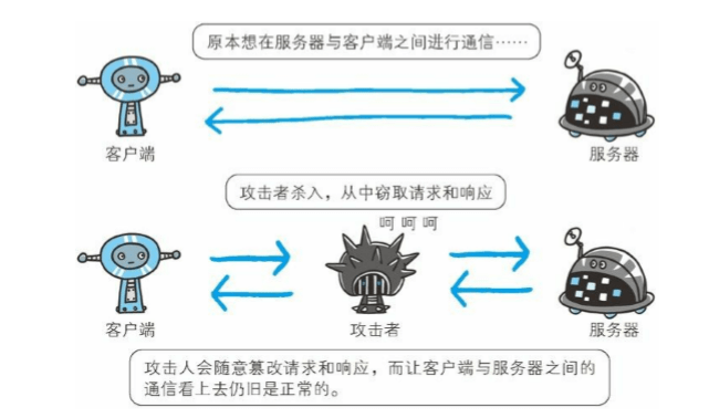 像这样,请求或响应在传输途中,遭攻击者拦截并篡改内容的攻击称为中间人攻击(Man-in-the-Middle attack,MITM)。