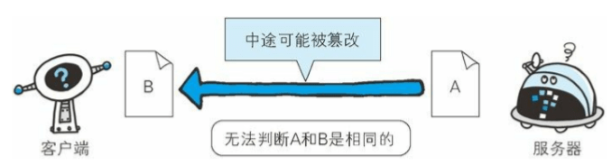 比如,从某个 Web 网站上下载内容,是无法确定客户端下载的 文件和服务器上存放的文件是否前后一致的。文件内容在传输途 中可能已经被篡改为其他的内容。即使内容真的已改变,作为接收方的客户端也是觉察不到的。