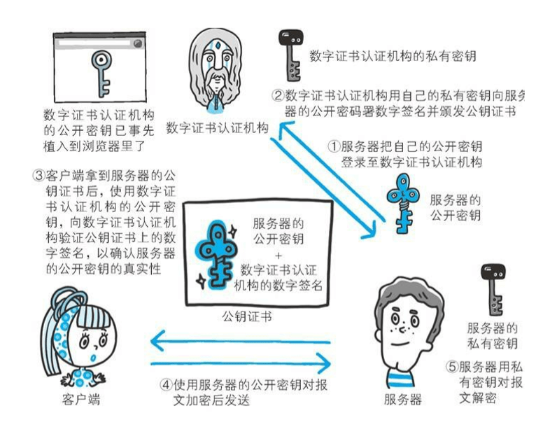 遗憾的是,公开密钥加密方式还是存在一些问题的。那就是无法证明 公开密钥本身就是货真价实的公开密钥。比如,正准备和某台服务器 建立公开密钥加密方式下的通信时,如何证明收到的公开密钥就是原 本预想的那台服务器发行的公开密钥。或许在公开密钥传输途中,真 正的公开密钥已经被攻击者替换掉了。为了解决上述问题,可以使用由数字证书认证机构(CA,Certificate Authority)和其相关机关颁发的公开密钥证书。数字证书认证机构处于客户端与服务器双方都可信赖的第三方机构的 立场上。威瑞信(VeriSign)就是其中一家非常有名的数字证书认证 机构。我们来介绍一下数字证书认证机构的业务流程。首先, 服务器 的运营人员向数字证书认证机构提出公开密钥的申请。数字证书认证 机构在判明提出申请者的身份之后,会对已申请的公开密钥做数字签 名,然后分配这个已签名的公开密钥,并将该公开密钥放入公钥证书 后绑定在一起。服务器会将这份由数字证书认证机构颁发的公钥证书发送给客户端,以进行公开密钥加密方式通信。公钥证书也可叫做数字证书或直接称为证书。接到证书的客户端可使用数字证书认证机构的公开密钥,对那张证书 上的数字签名进行验证,一旦验证通过,客户端便可明确两件事: 一,认证服务器的公开密钥的是真实有效的数字证书认证机构。二, 服务器的公开密钥是值得信赖的。此处认证机关的公开密钥必须安全地转交给客户端。使用通信方式 时,如何安全转交是一件很困难的事,因此,多数浏览器开发商发布版本时,会事先在内部植入常用认证机关的公开密钥。
